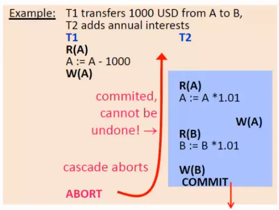 - R(A) x W(A) - neopakovatelné čtení (Může způsobovat neplechu, pokud např. nejdříve v T1 přečteme stav nějaké účtu, v T2 převedeme peníze z onoho účtu na jiný, a pak spočítáme úroky na všech účtech a dokončíme první transakci. To nám způsobí, že úroky na prvním účtě budou vyšší, než by ve skutečnosti měly být, poněvadž má první transakce načtený stav prvního účtu před a druhého účtu po převodu.)
