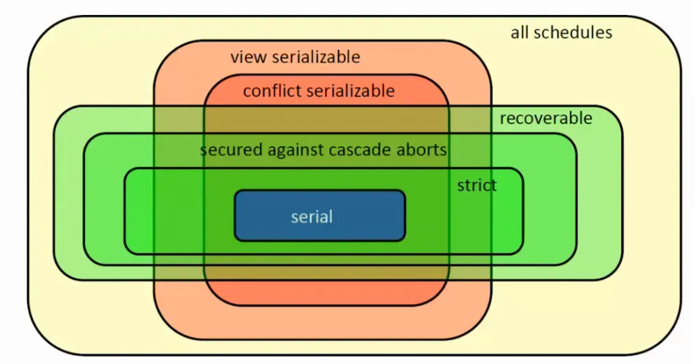 U rozvrhů nás také zajímá, zda jsou tzv. obnovitelné v případě ukončení některé z transakcí. Pokud některá z transakcí čte nepotvrzená data, musí její potvrzení následovat po potvrzení čtených dat, jinak hrozí, že transakce, která data původně změnila, se ukončí, avšak druhá transakce již nepůjde vrátit zpátky, protože byla potvrzena.